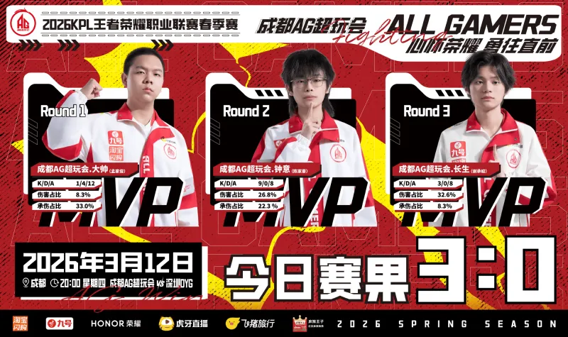 虎扑03月12日讯 AG赛后发文:希望大家可以保持好状态,沉住气一步稳稳前进,原文如下:2026KPL春季赛·常规赛第三轮 | 今日赛果成都AG超玩会 3 : 0 深圳DYG今日胜局的MVP给到了AG大帅11、成都AG_钟意 和AG长生顺利拿下!大家都太棒啦!但这还远远不是终点,希望大家可以在赛程更加紧凑的第三轮里保持好状态,沉住气一步一步稳稳前进!来源:微...